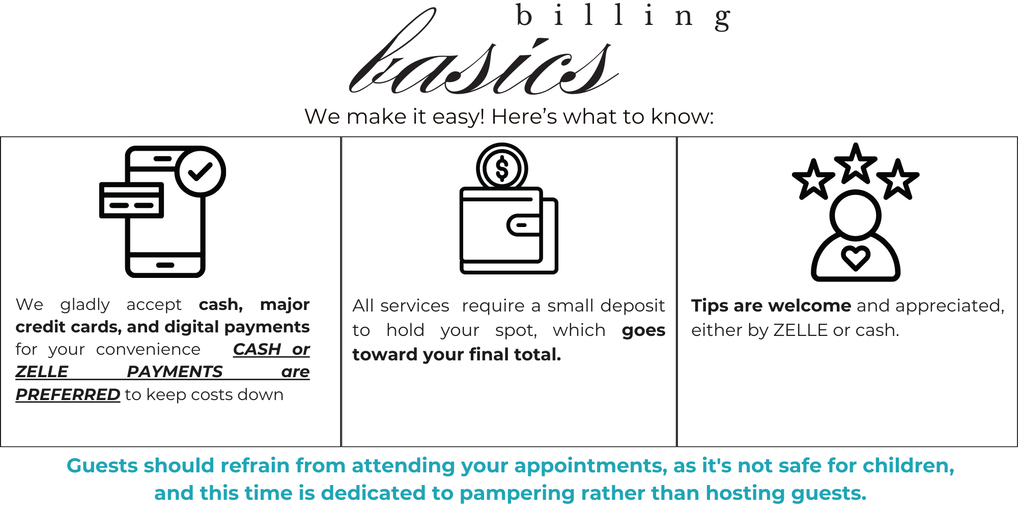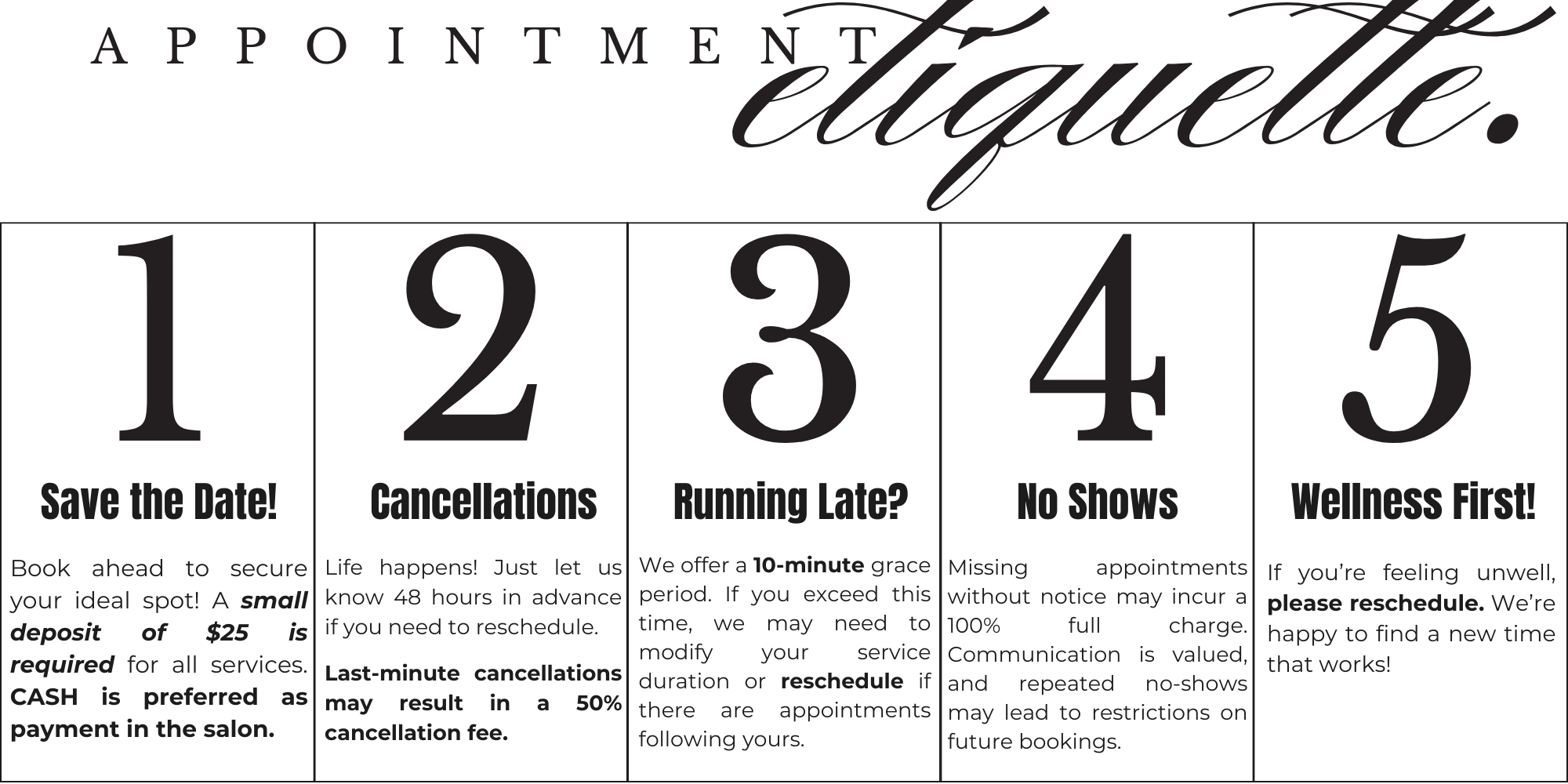 Please be mindful that all cancellations require a minimum of 48 hours' notice, as this allows us to accommodate other clients who may be seeking appointments. Additionally, reschedules under 48 hours are only considered valid if the appointment is moved to another time within the same week. If the appointment is not rescheduled within this timeframe, it will be treated as a cancellation and will incur a cancellation fee. Thank you for your understanding and cooperation.
